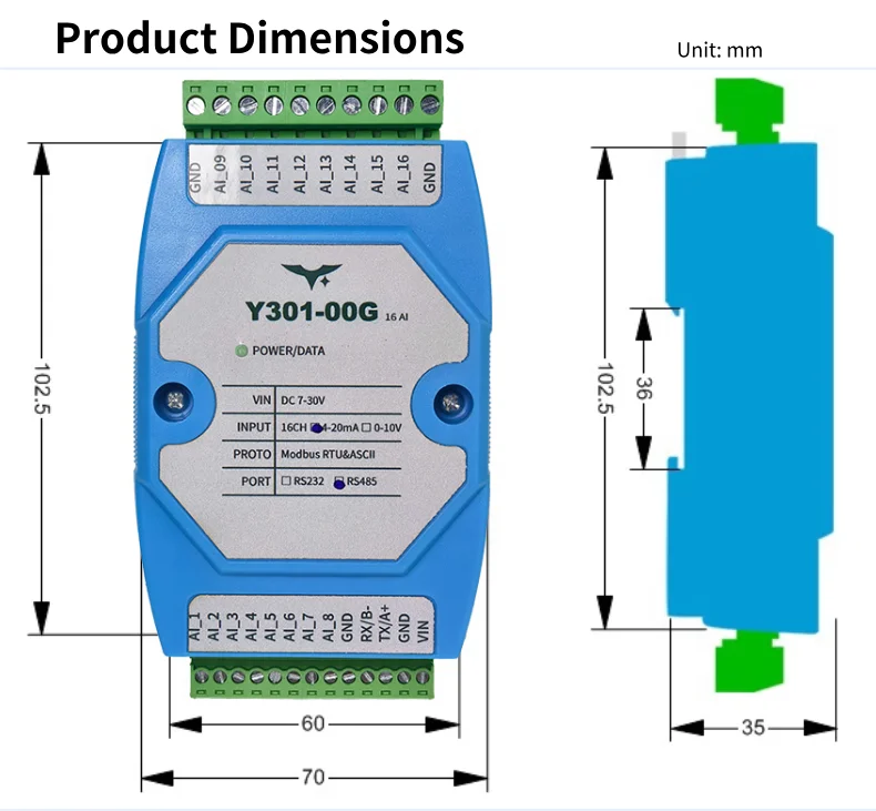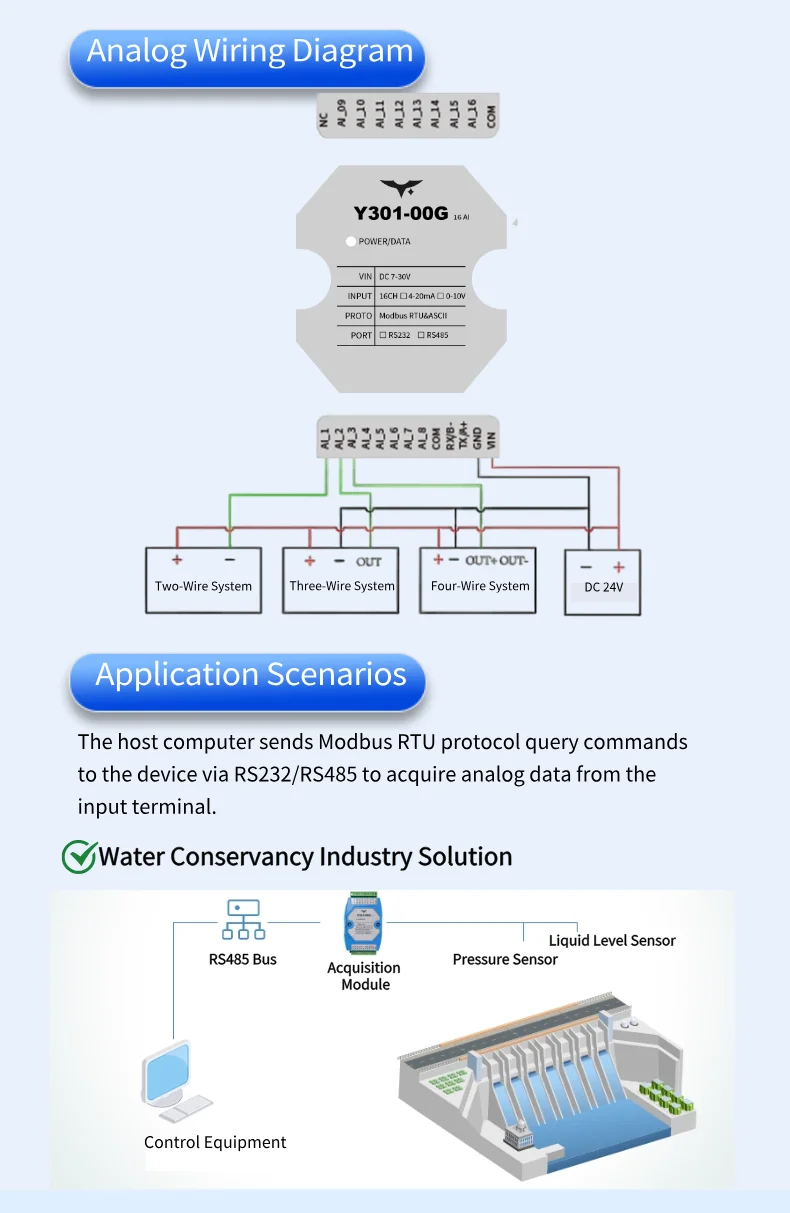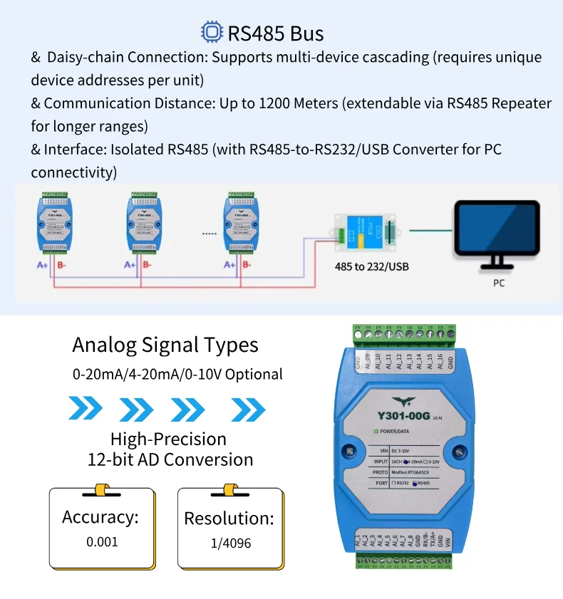 Supports 4-20mA/0-10V analog signals, 12-bit AD conversion (1/4096 resolution), compatible with IoT sensors (temperature, humidity, pressure, liquid level, etc.).