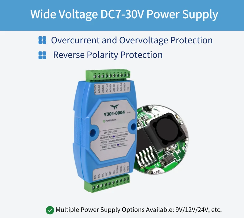 DC12-30V wide voltage input (supports 9V/12V/24V power sources). Built-in overcurrent, overvoltage, and reverse polarity protection, plus 1500V surge protection, enhancing durability in harsh industrial environments.