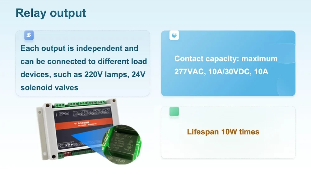 ▲Powerful load capacity: 277VAC/10A contact rating, directly drives 220V loads; expandable to 380V with contactors.
