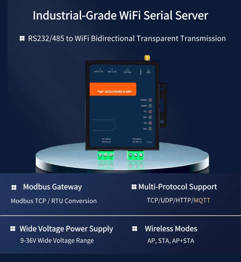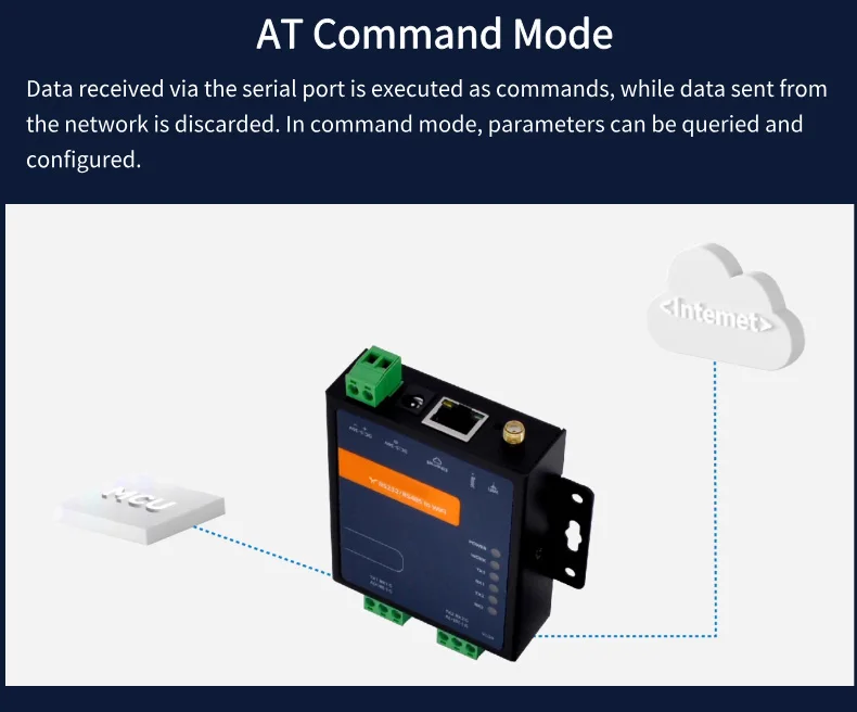 ▲Bidirectional Data Transmission: Seamless RS232/RS485 to WiFi conversion, supporting transparent data transfer and AT command configuration.