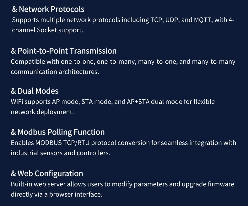 ▲Modbus Protocol Expert: IntegratesModbus TCP/RTU conversion for easy integration with PLCs, sensors, and IoT platforms.
