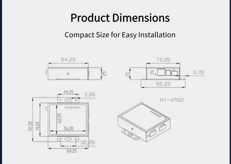 ▲Hardware: 240MHz dual-core MCU, 10/100M Ethernet port, compact design (84×70×25mm) with wall-mounting holes.