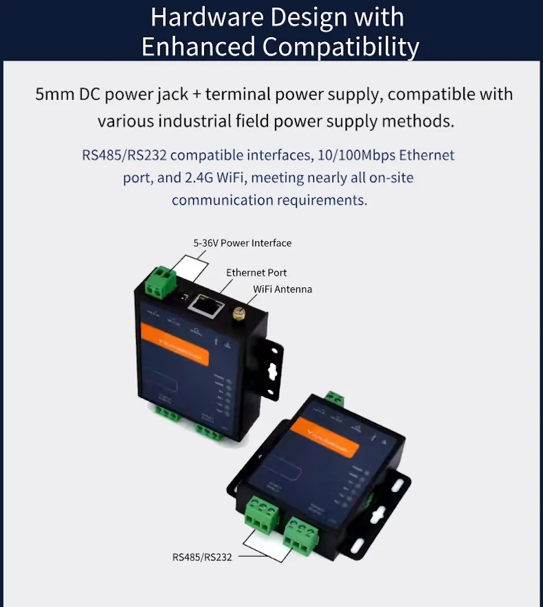 ▲Industrial-Grade Reliability: -40~85℃operating temperature, surge/ESD protection (Class B/Class A), and 5-36V wide voltage power supply.